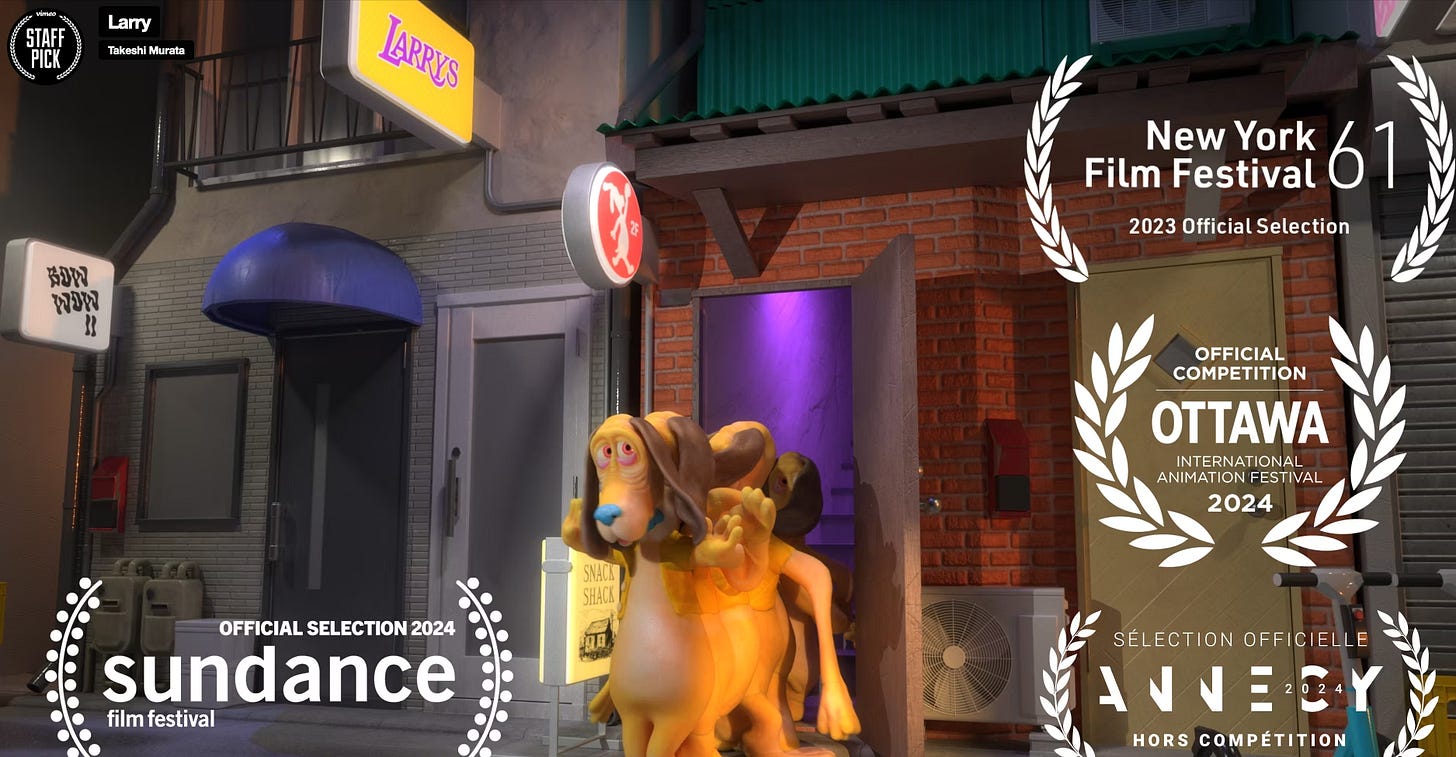 I’m really proud of a lot of my collaborations, especially ‘Larry’ with Takeshi Murata which has taken us to Sundance and a bunch of other cool festivals. I’m also insanely proud of my collaborations with Tom Goulet who is one of my favorite people and such a pleasure to work with every time. Specifically the shorts ‘Small Talk’ and ‘Man’s Best Friend’ we made for Adult Swim Smalls back in 2019-2021. I’m hoping we can do more of these live action animation hybrid shorts together some day :)